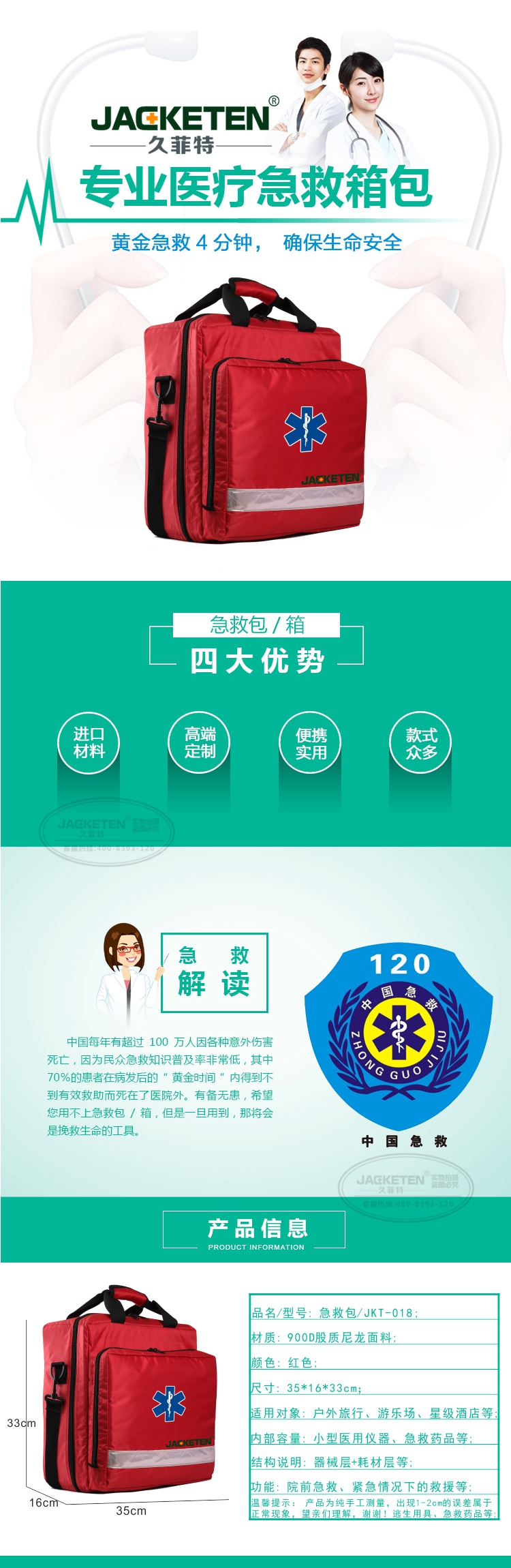 品名/貨號(hào):急救包/JKT-018;材質(zhì):900D股質(zhì)尼龍面料;顏色:紅色;尺寸:35*16*33cm;適用對(duì)象:戶外旅行、游樂場(chǎng)、星級(jí)酒店等;內(nèi)部容量:小型醫(yī)用儀器、急救藥品等;結(jié)構(gòu)說(shuō)明:器械層+耗材層;功能:院前急救、緊急情況下的救援等